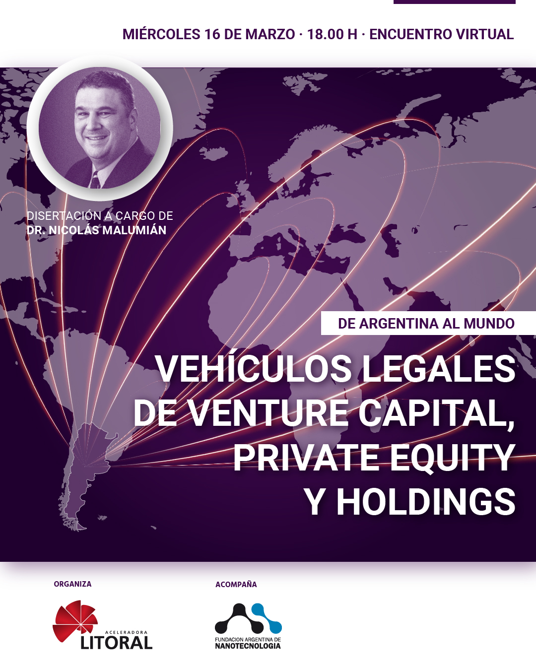 El evento se realizará el miércoles 16 de marzo a las 18:00hs por Plataforma de Zoom y tiene como meta explicar la estructura legal y fiscal de los fondos de venture capital, acuerdos de private equity y holdings globales, brindando herramientas para su comprensión y desarrollo para emprendimientos argentinos que buscan recibir inversiones internacionales o posicionarse en el exterior.